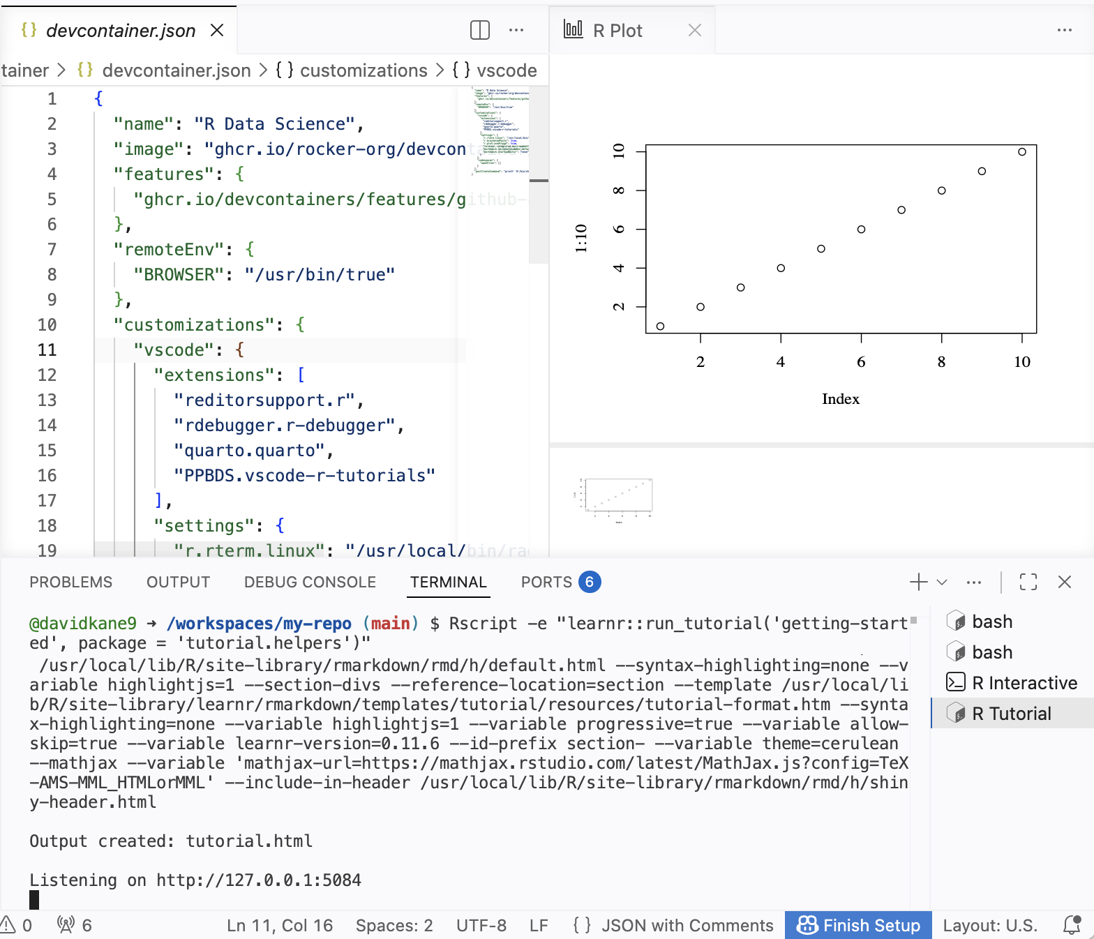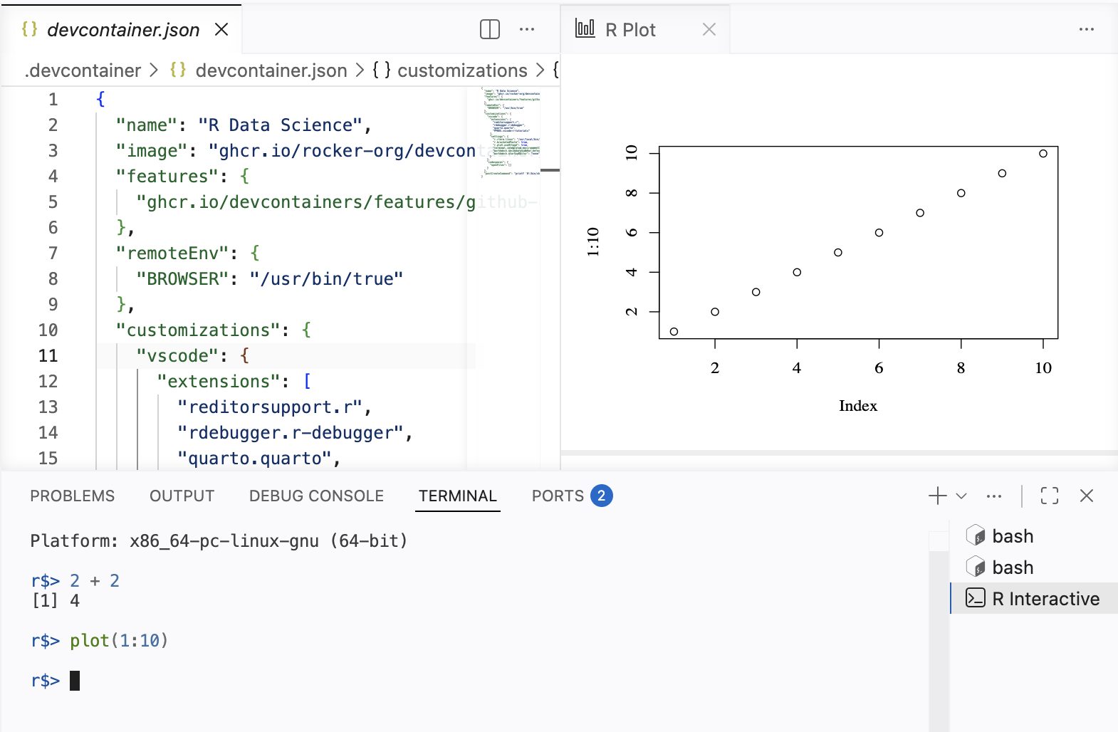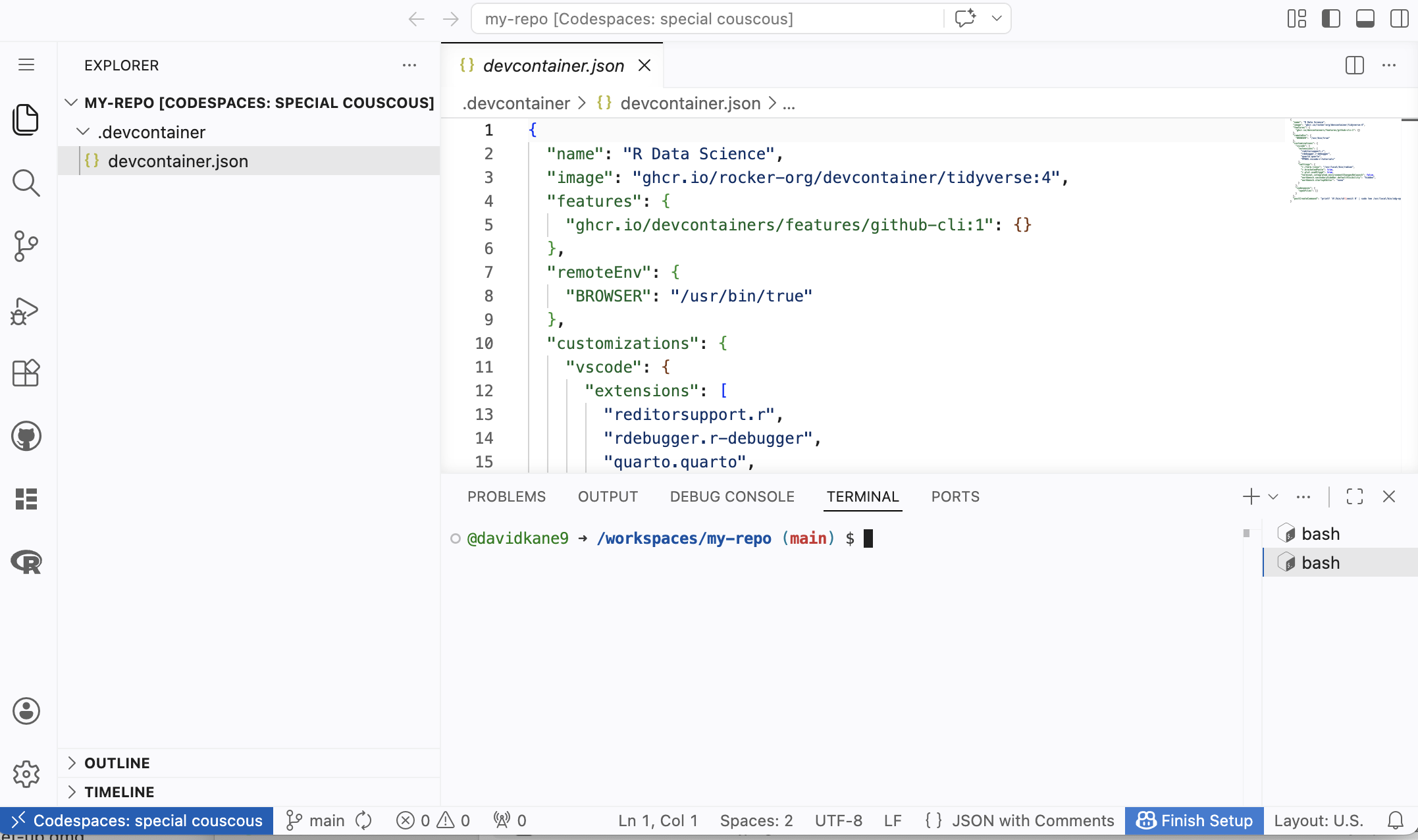 devcontainer.jsonfile in the.devcontainerfolder, the file will be opened in the editor. Do that now.The “Panel” is the horizontal area below the Editor, containing the Terminal, Output, Problems, Debug Console, and Ports tabs. Our main focus is in the Terminal tab. This is where we “talk” to both the (cloud) computer itself and to the R program which it provides.