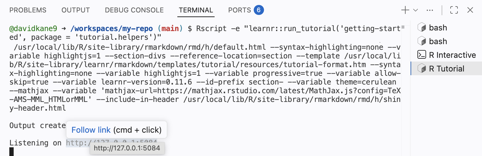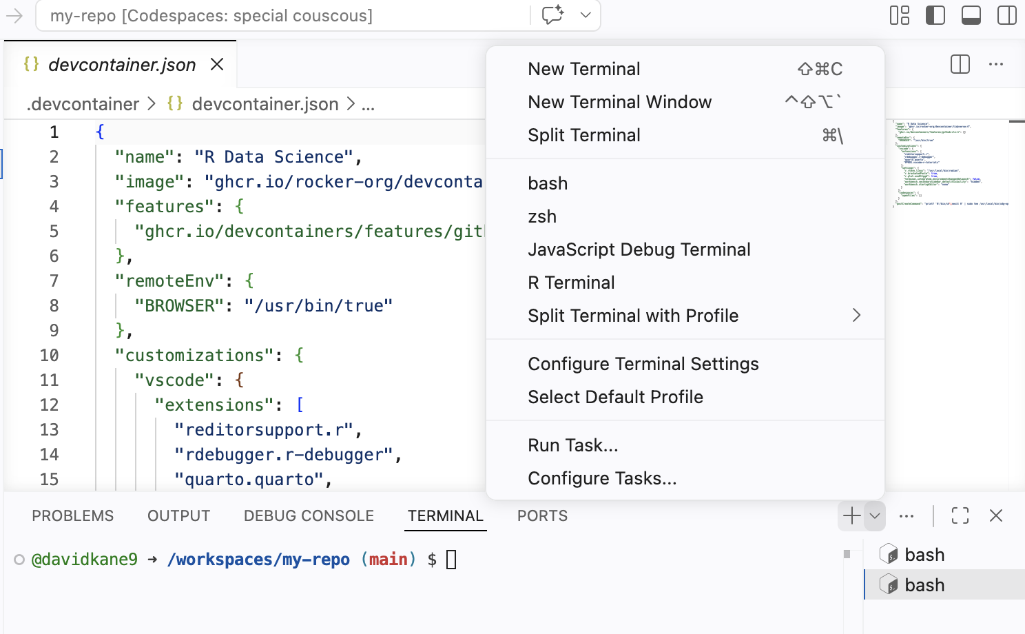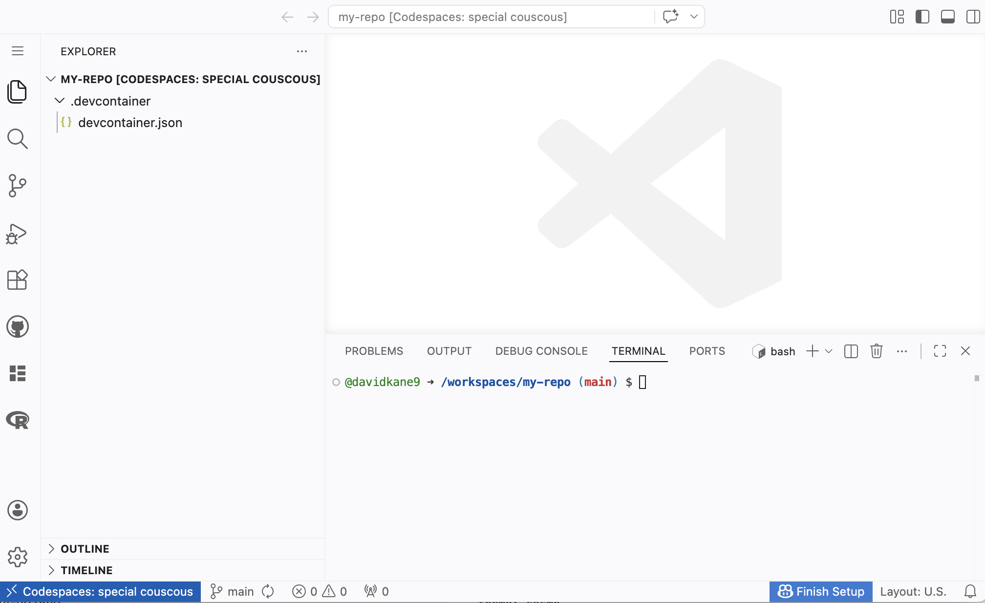 devcontainer.jsonfile in the.devcontainerfolder, the file will be opened in the editor. Do that now.The “Panel” is the horizontal area below the Editor, containing the Terminal, Output, Problems, Debug Console, and Ports tabs. Our main focus is in the Terminal tab. This is where we “talk” to both the (cloud) computer itself and to the R program which it provides.