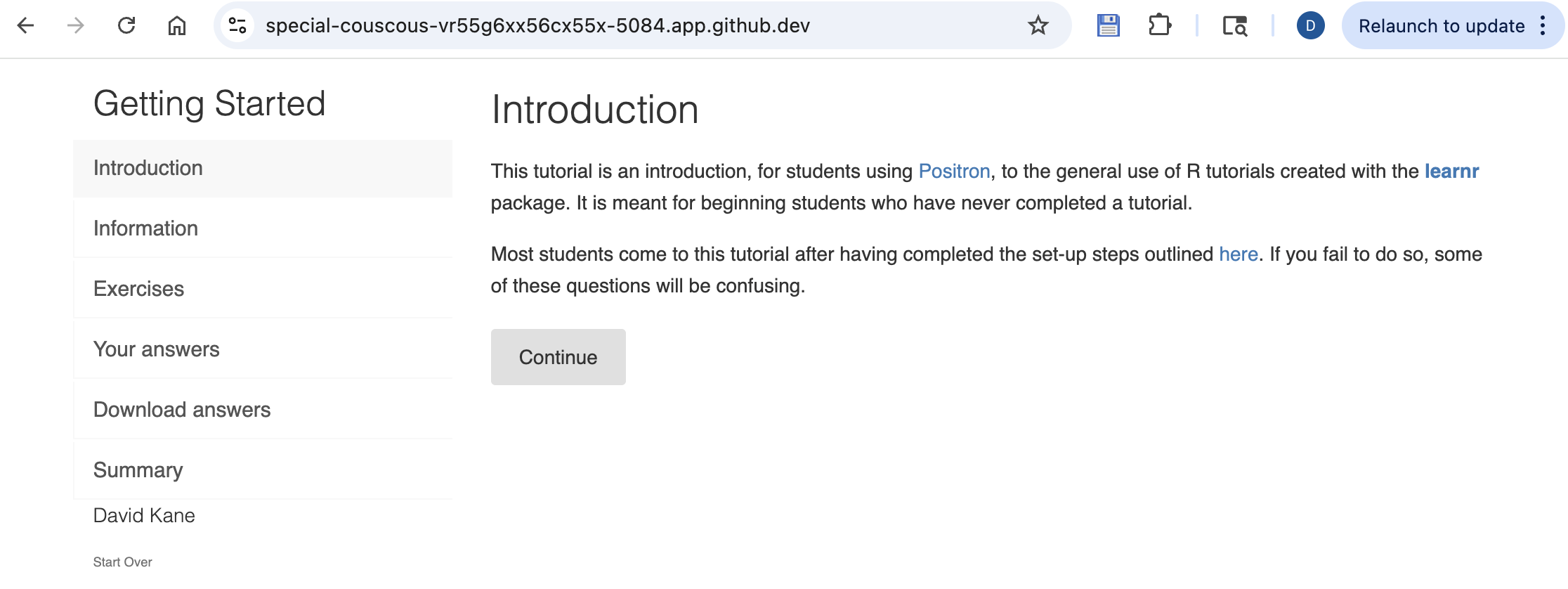 This shows all the R tutorials which are currently installed. If you hover your cursor over a tutorial, a rightward pointing arrow appears. Clicking that arrow starts the tutorial. Start the “Getting Started” tutorial from the tutorial.helpers package. Do so now.