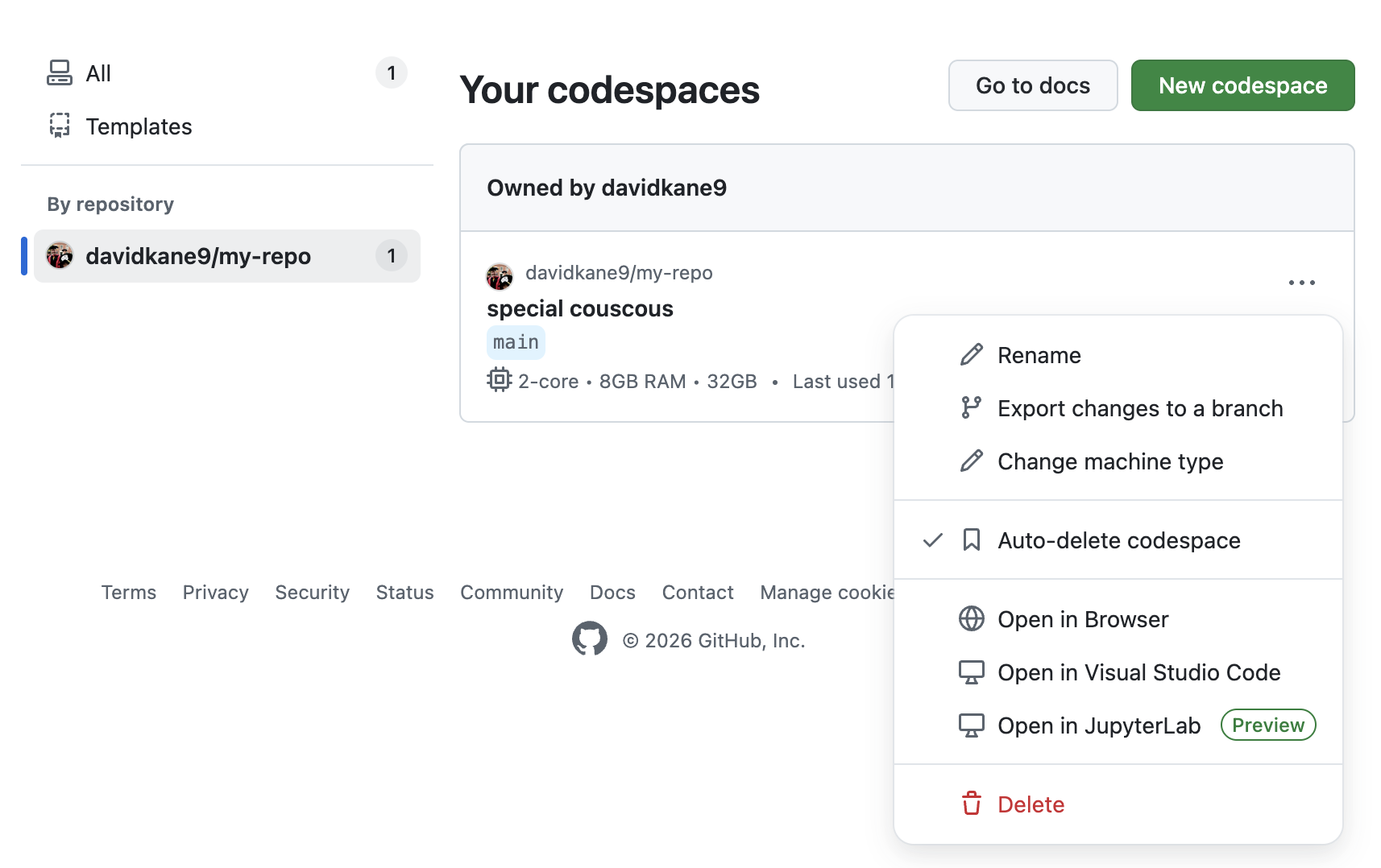 I only have one codespace. It was started from one of my repos, as we know. Selecting it, and also clicking on the three dots–...–in the upper left, we have some options: