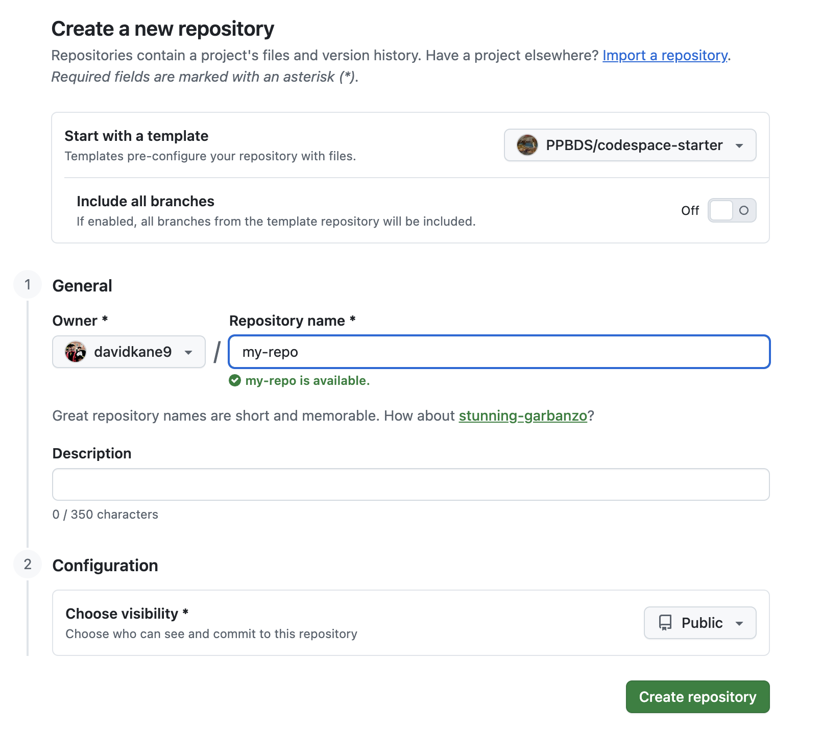 VS Code takes you to this next screen, allowing you to name the new repository, which will be a copy of the PPBDS/codespaces-starter repo, but under your control because it is located on your GitHub account instead of under the PPBDS account. Note the davidkane9 in the screenshot, which is my GitHub account.