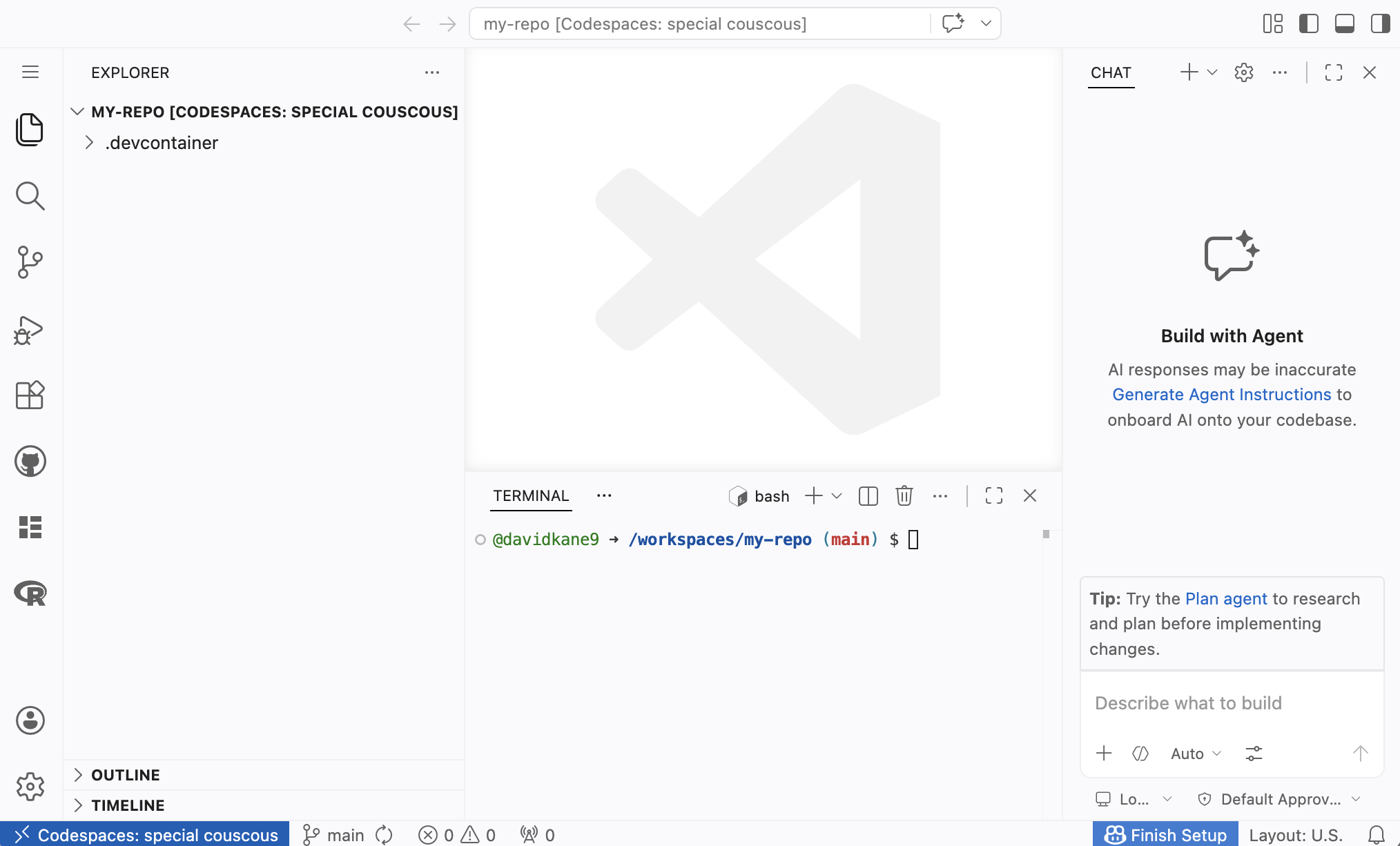 special-couscousin this case–and a bunch of letters and numbers. There is no need to remember this URL. GitHub keeps track of things. You can see all your current codespaces here.In the upper righthand corner are the “Customize Layout …” buttons. These are part of the VS Code “Title Bar.” Since we aren’t using the AI tools right now, it often makes sense to close the “Chat” window, which is the right side of the screen. You can close this in two ways: Click the “X” mark or click the “Toggle Secondary Side Bar” button, the furthest righthand button. You can then bring the Chat window back by clicking the “Toggle Secondary Side Bar” button again. Try it now.