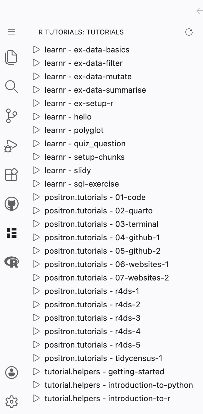 If you hover your cursor over the Activity Bar on the far lefthand side, you can see the names of the different options. The second from the bottom is labeled “R Tutorials.” Click on it. (You might need to click twice.)
